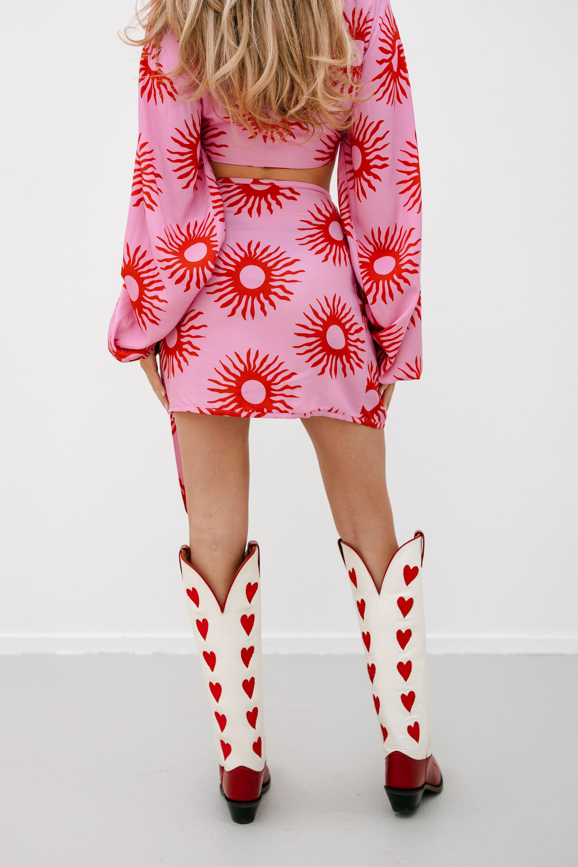The Blush Babe Skirt features the same stunning print as its matching Blush Babe Top, creating a visual impact that's impossible to ignore. The flattering cut and careful construction ensure both comfort and style, while the versatile design makes it perfect for daytime adventures or evening escapades.